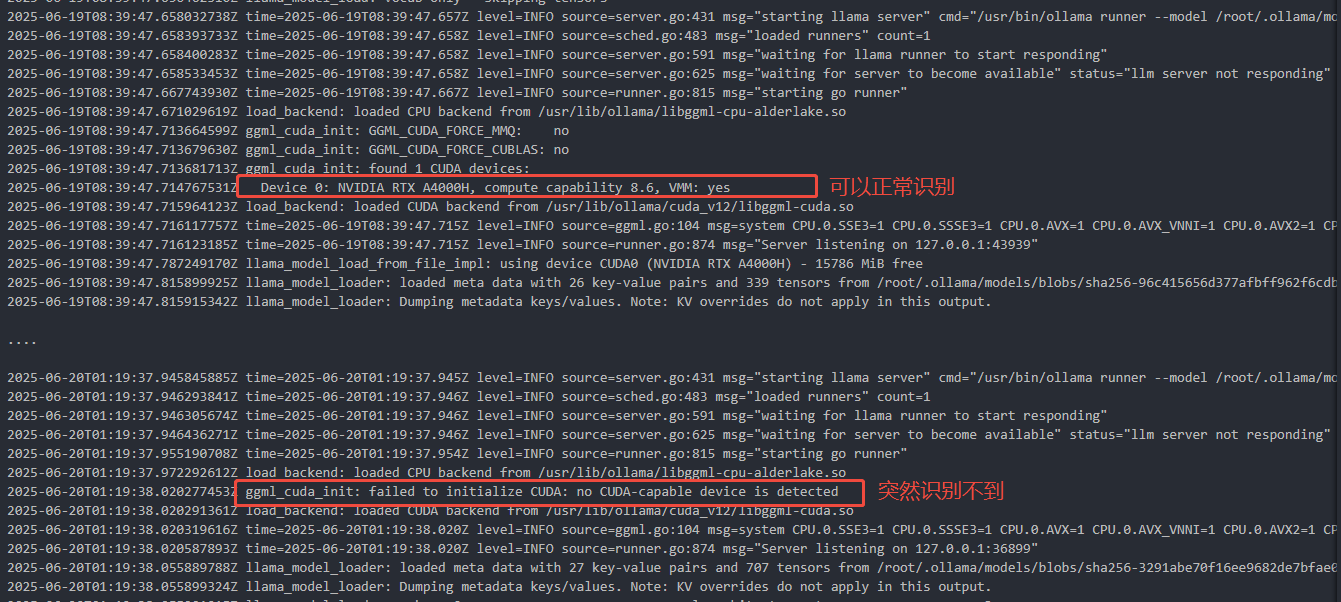 在 Docker 容器中运行 Ollama 时, GPU 最初可用,但运行一段时间后会突然失效,无法被 Ollama 识别到。